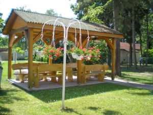 - fedett kerti fa bútor, étkezésre alkalmas kialakítással, szabadban kialakított faszenes roston sütési lehetőség az udvarban